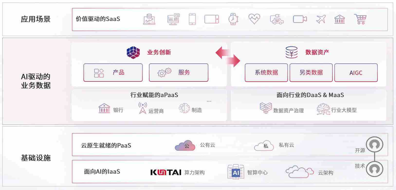数字时代,,,围绕企业数字化转型的关键要素,,AG尊龙凯时数码开创性的提出数云融合战略和技术体系框架,,,,着力在云原生、、、、数字原生、、AI原生和信创产业上架构产品和服务能力,,为处在不同数字化转型阶段的快消零售、、、汽车、、、金融、、医疗、、、政企、、教育、、运营商等行业客户提供泛在的敏捷IT能力和融合的数据驱动能力,,,,构建跨界融合创新的数字业务场景和新业务模式,,助力企业级客户建立面向未来的核心能力和竞争优势,,,全面推动社会的数字化、、、智能化转型升级。。。